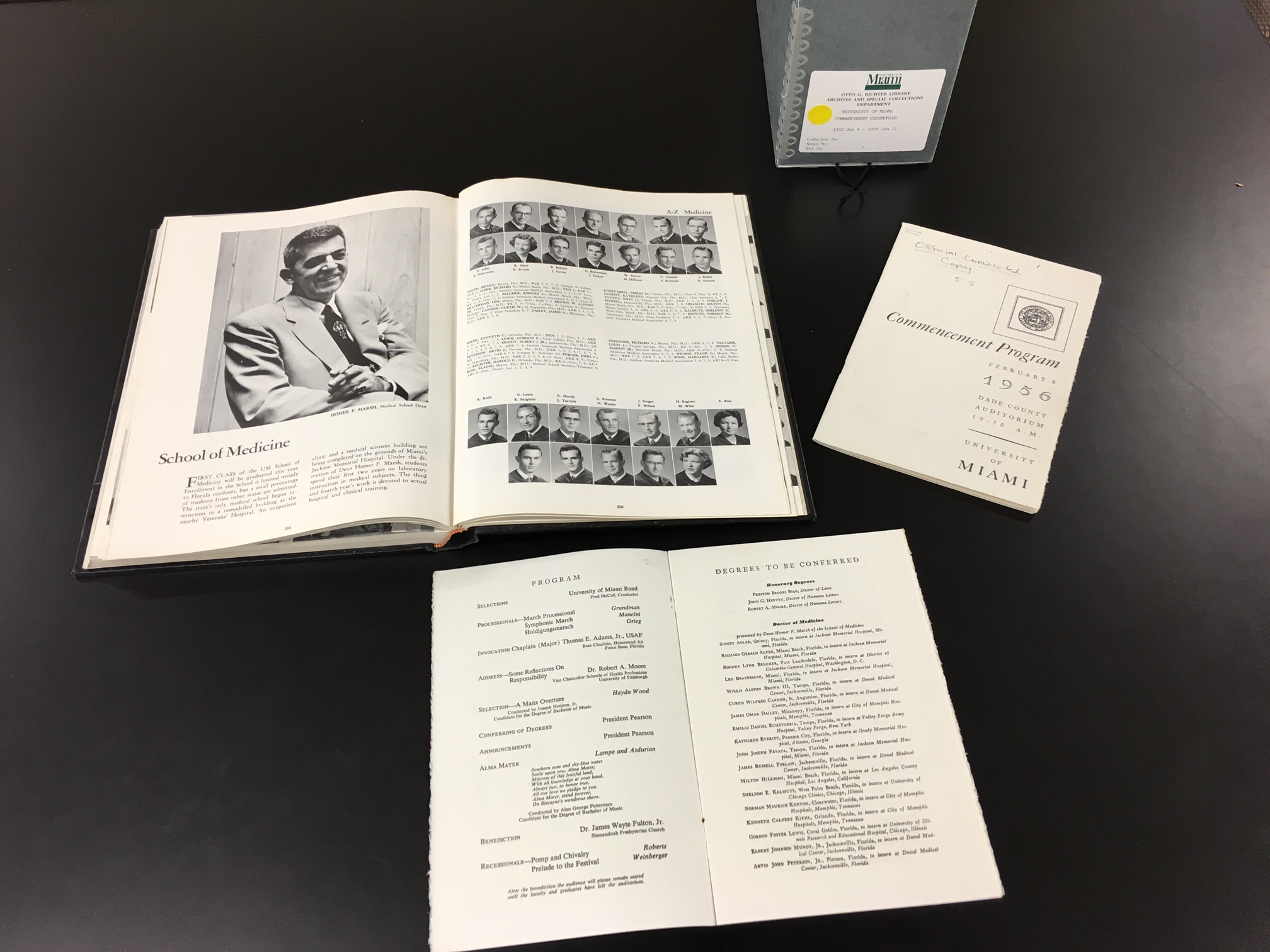 1956 Ibis yearbook and June 11, 1956 Commencement Program are a few examples of the materials available on the subject at the Archives. The UM Office of the President Records and the School of Medicine Records provide in-depth historical information on the School. We can also offer excellent collection of historical images from the UM Historical Photograph Collections (1920s to 1970s) and the UM University Communications Collection (1980s to 2000s)