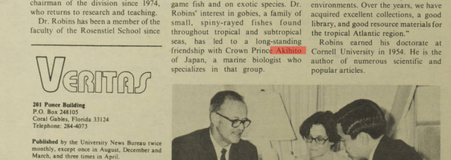 As a native of Japan and University Archivist of the UM, this is a great time for me to inform the University community that Emperor Akihito visited the University of Miami twice in the past because of the long-lasting friendship of then Crown Prince Akihito and Dr. C. Richard Robins, who was a professor at the Rosenstiel School of Marine and Atmospheric Science.