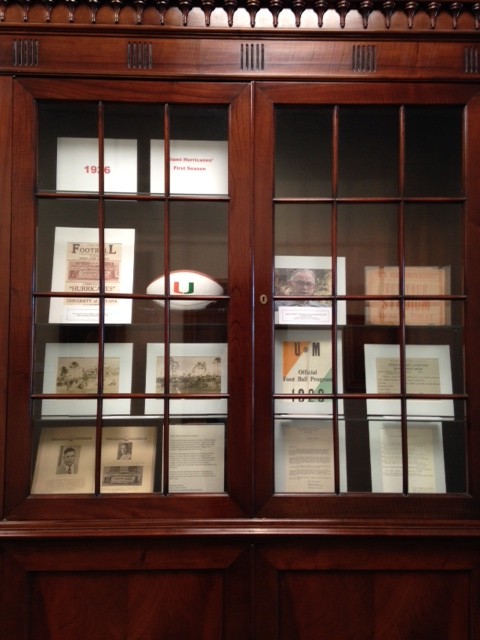 Special Collections Research Services & Projects Assistant Steve Hersh and University Archivist Koichi Tasa worked with Scott Fricker, UM’s director of creative services, to search, sort, and select fitting materials and publications from the time period referenced in the story. The Archives’ assemblage of UM’s publications, photographs, and memorabilia served the need well, yet it was in Special Collections’ Orange Bowl Committee Archives that some of the more story-specific items were uncovered. Mr. Hersh had to be especially resourceful in his search through these materials to narrow in on the precise time period. The Orange Bowl Committee Archives are quite thorough and thousands of historical items deep, containing scrapbooks, photographs, programs, newspaper clippings, Committee meeting minutes, and many other objects and collectibles.